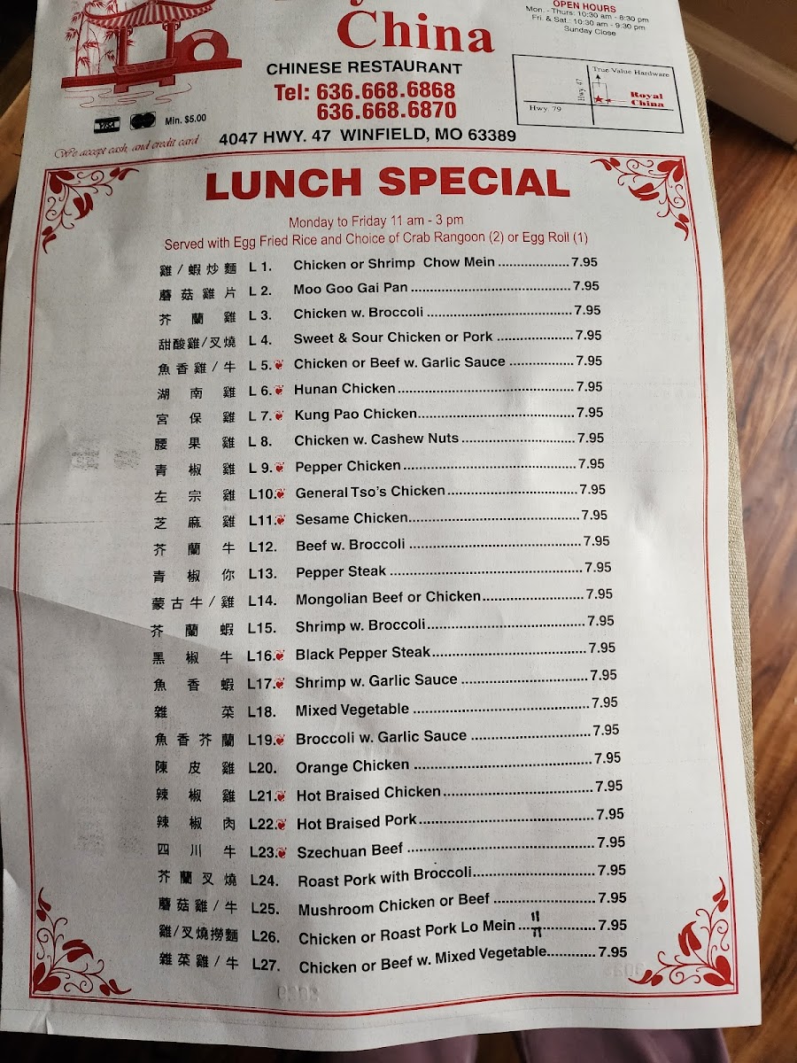 Welcome to Royal China, a culinary gem nestled at 4047 State Hwy 47, Winfield, MO. This delightful restaurant redefines convenience and flavor with a diverse menu that caters to every palate. Whether you crave a comforting plate of Fried Rice or the savory sweetness of Honey Chicken, there’s something for everyone.